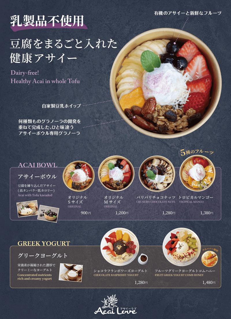 幸せのパンケーキから、新ブランド誕生。 乳製品不使用、豆腐をまるごと入れたアサイーや、コムハニーを贅沢にトッピングしたグリークヨーグルト。 アサイーラブ 梅田店、横浜店、船橋店、神戸店、札幌店NEW OPEN アサイーラブ 名古屋店 11/10 14時プレオープン